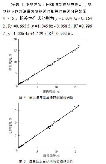 前述的實驗結(jié)果說明 ,用三種不同方法測定不同類型的油樣時 ,所得殘?zhí)繑?shù)據(jù)間的相關(guān)性有好有